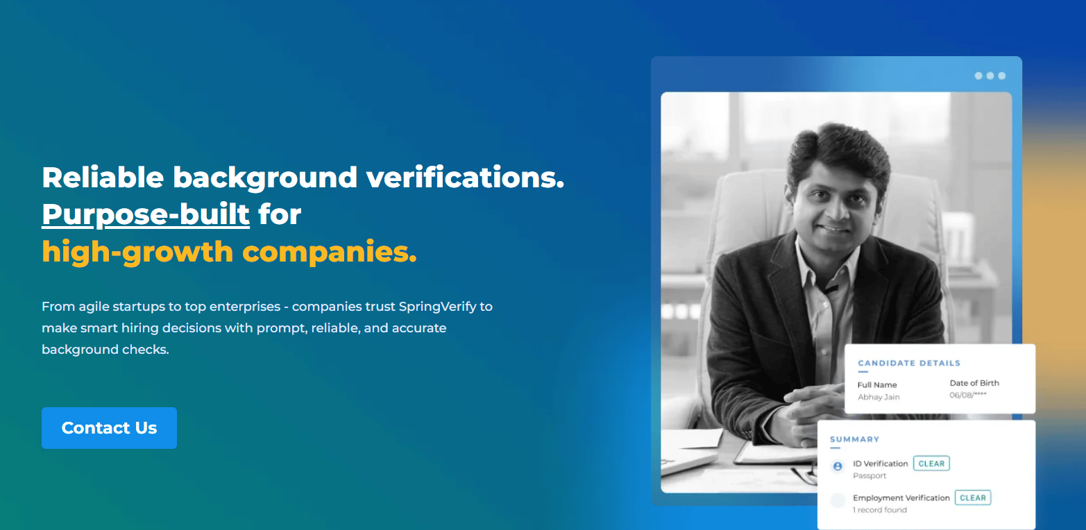 Trusted by HR professionals across industries, SpringVerify helps you verify candidates quickly, accurately, and hassle-freeāso you can focus on finding the right fit without the usual paperwork headaches.