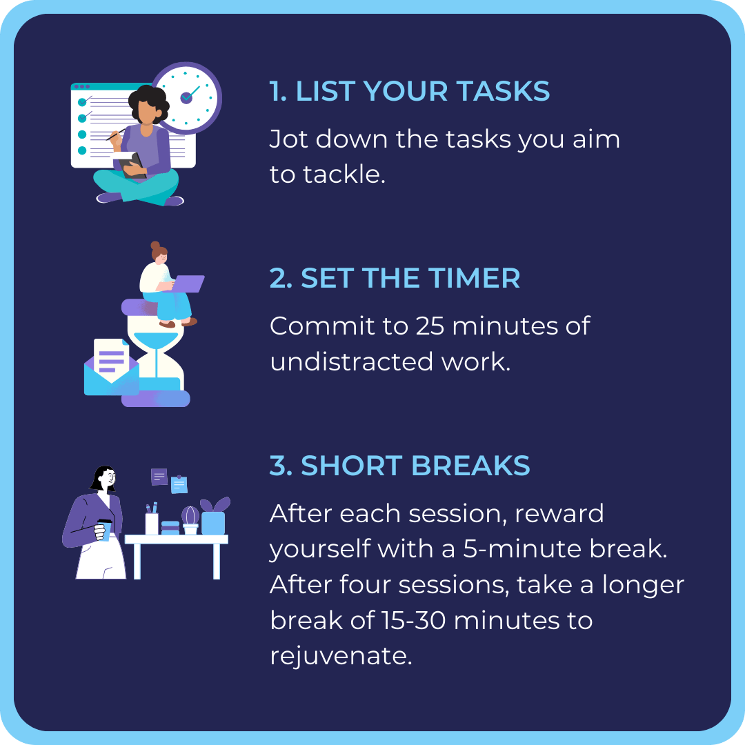 The Pomodoro Technique is a simple time management method that divides work into 25-minute intervals, followed by short breaks. This approach can help improve focus, keep your mind sharp, and increase productivity.